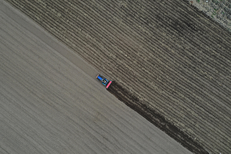 吉林省安圖縣龍山村農民在田間播種玉米(5月8日無(wú)人機拍攝)。新華社記者 林宏 攝