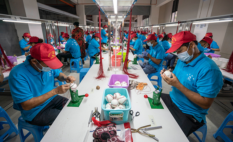 5月14日,云南省怒江傈僳族自治州怒江新城城墻壩易地扶貧安置點(diǎn)棒球工廠(chǎng)的工人在制作棒球。新華社記者 江文耀 攝