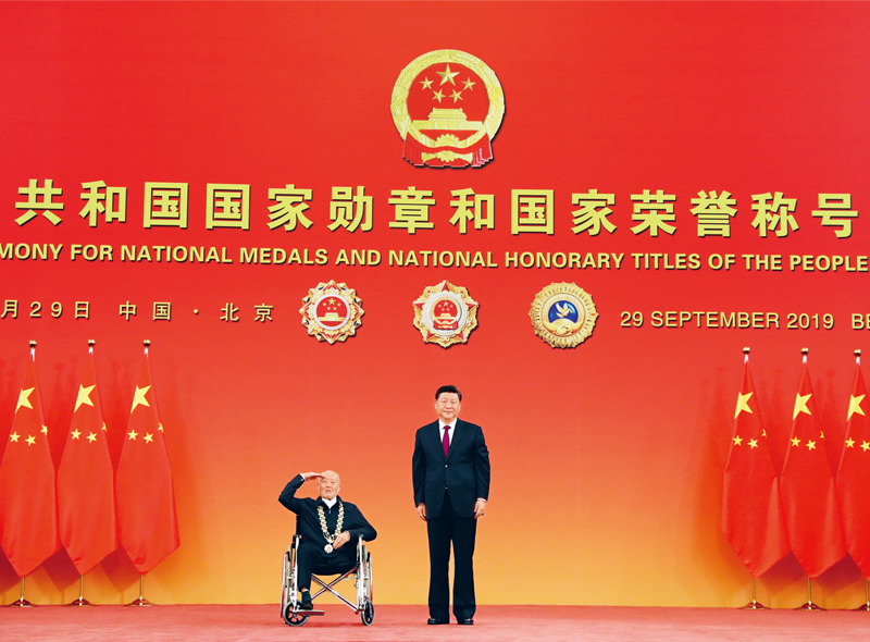 2019年9月29日,中華人民共和國國家勛章和國家榮譽(yù)稱(chēng)號頒授儀式在北京人民大會(huì )堂金色大廳隆重舉行。中共中央總書(shū)記、國家主席、中央軍委主席習近平向“共和國勛章”獲得者張富清頒授勛章。 新華社記者 王曄/攝