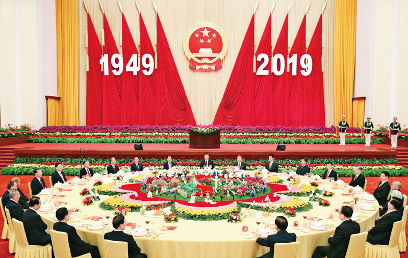 2019年9月30日晚,慶祝中華人民共和國成立70周年招待會(huì )在北京人民大會(huì )堂隆重舉行。習近平、李克強、栗戰書(shū)、汪洋、王滬寧、趙樂(lè )際、韓正、王岐山等黨和國家領(lǐng)導人與4000余名中外人士歡聚一堂,共慶新中國70華誕。 新華社記者 黃敬文/攝