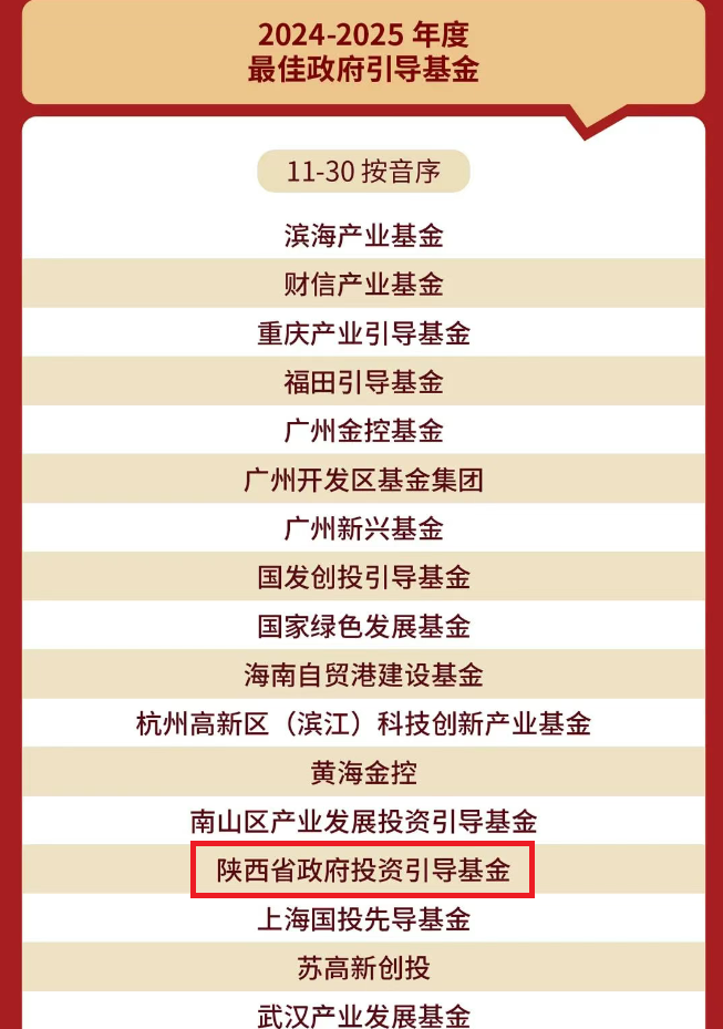 2025年7月23日,融資中國2024-2025年度有限合伙人榜單盛大發(fā)布,陜西省政府投資引導基金(以下簡(jiǎn)稱(chēng)“引導基金”)榮獲“2024—2025年度最佳政府引導基金TOP30”、“2024—2025年度最佳省級政府引導基金TOP20”。這是引導基金連續4年獲此榜單殊榮,并今年首次入圍省級20強!