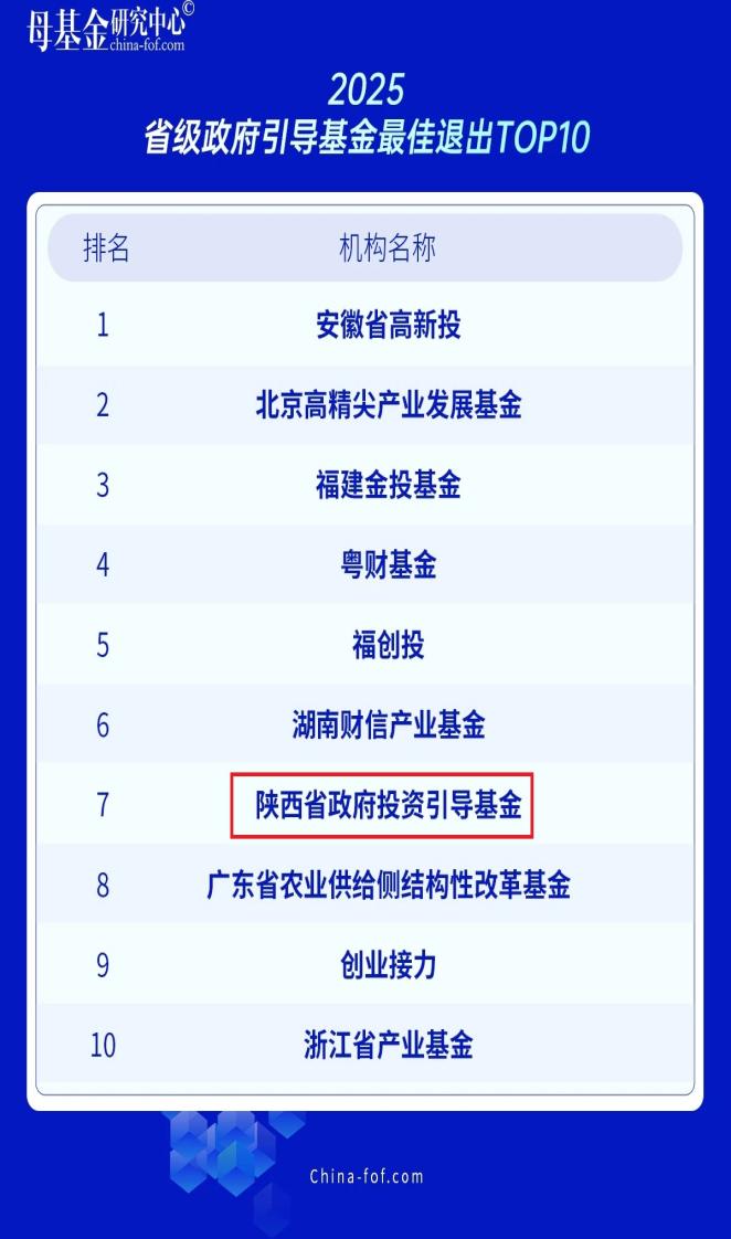 2025年9月1日,母基金研究中心正式發(fā)布了2025年度榜單,陜西省政府投資引導基金(以下簡(jiǎn)稱(chēng)“引導基金”)榮獲“2025省級政府引導基金最佳退出TOP10”第7名及“2025省級政府引導基金最佳風(fēng)控TOP30”獎項第16名。